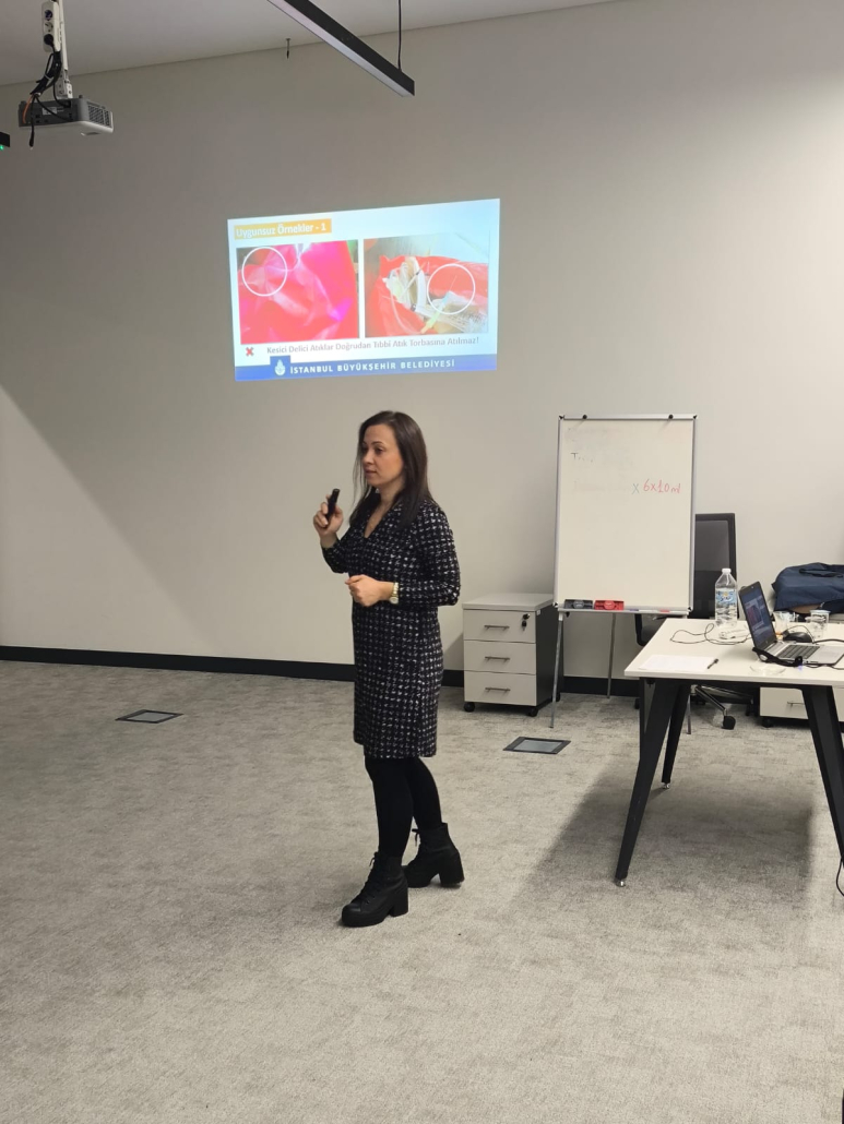 Ayrıca eğitim kapsamında, tıbbi atıklarla temas sonucu meydana gelebilecek kesici ve delici alet yaralanmalarına dikkat çekilerek, bu tür iş kazalarının önlenmesine yönelik alınması gereken tedbirler hakkında kapsamlı bilgilendirme yapılmıştır.