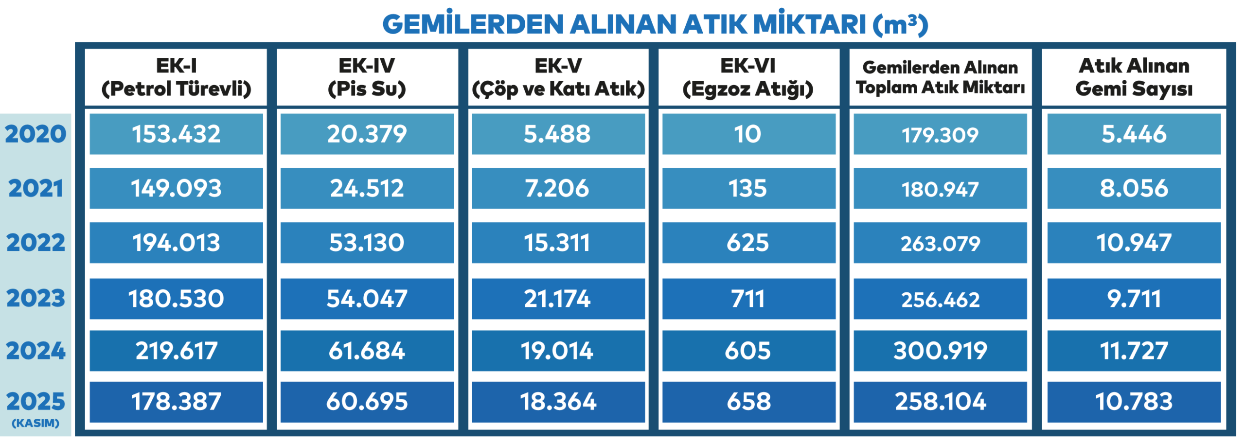 - 13 adet lisanslı atık alım gemisi ile Çevre ve Şehircilik Bakanlığının ücret tarifesi kapsamında deniz araçlarına atık alım hizmeti verilmektedir.
