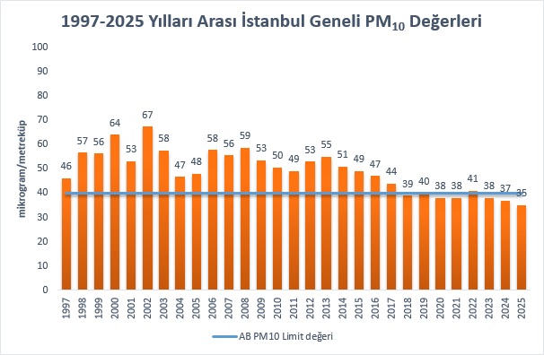 Partikül madde(Pm10) konsantrasyonlarındaki azalma ise 1997 yılından itibaren başlamış ve AB standartlarında belirtilen günlük 50 µg/m3 sınır değere yakın seviyelerde seyretmektedir. Partikül madde(Pm10) konsantrasyonları için belirli bir seviye yakalanmış olmakla birlikte, Büyükşehir Belediyemiz hava kalitesinde hedef olarak kendisine AB direktiflerinde belirtilen sınır değerleri kıstas olarak almakta ve çalışmalarını bu yönde sürdürmektedir. 2023 2025 yılı için, İstanbul geneli partikül madde ortalaması 35 µg/m3 düzeyindedir. İstanbul partikül madde Pm10 yıllık ortalama konsantrasyonlarında belirli bir seviye yakalanmış, 2013 yılından itibaren yaklaşık 15 mikrogramlık bir düşüş olduğu gözlenmiştir. İnce partikül madde Pm2.5 ölçümlerine Belediyemiz tarafından 2017 yılı itibariyle başlanmıştır. 2025 yılı Pm2.5 ortalamamız ise yaklaşık 17,5 µg/m3 civarındadır.